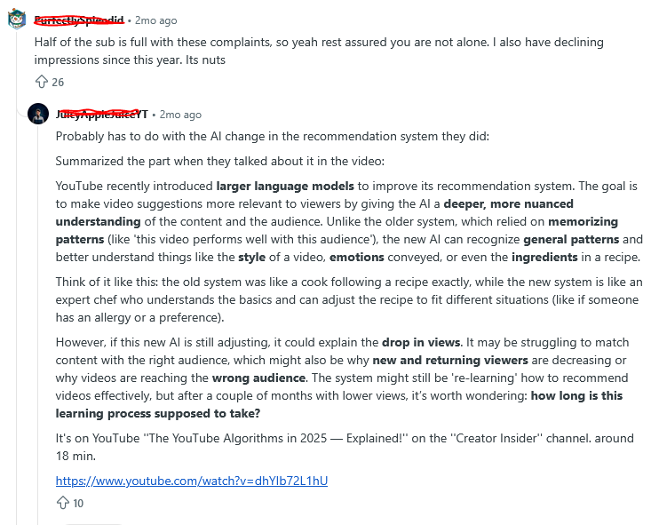 The most commonly cited cause of the decline is YouTube’s 2025 algorithm update, which now favors user satisfaction metrics—likes, comments, and post-view survey feedback—over legacy indicators like click-through rate (CTR) and watch time. This shift rewards creators who can maintain prolonged engagement, but others feel buried by the changes.