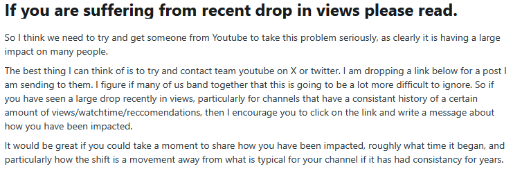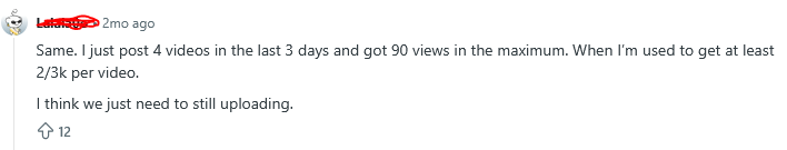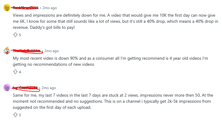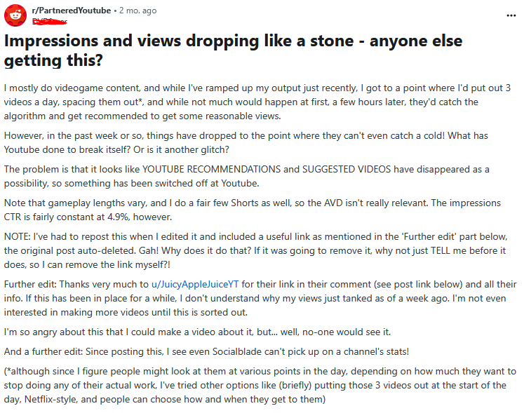 A gaming content creator saw views fall by 70%, despite producing 15–20 videos weekly. Similarly, a cooking-focused channel owner shared that daily views had plummeted from 20,000 to just 3,000. In a separate thread, another said their channel saw a 40% view decline and asked if others saw the same.