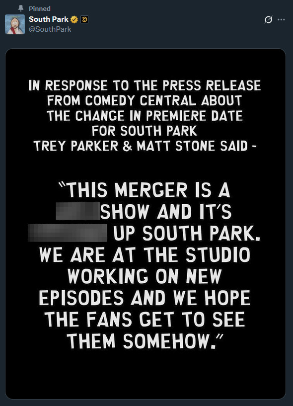 "This merger is a s***show and it’s f****** up South Park. We are at the studio working on new episodes and we hope the fans get to see them somehow."